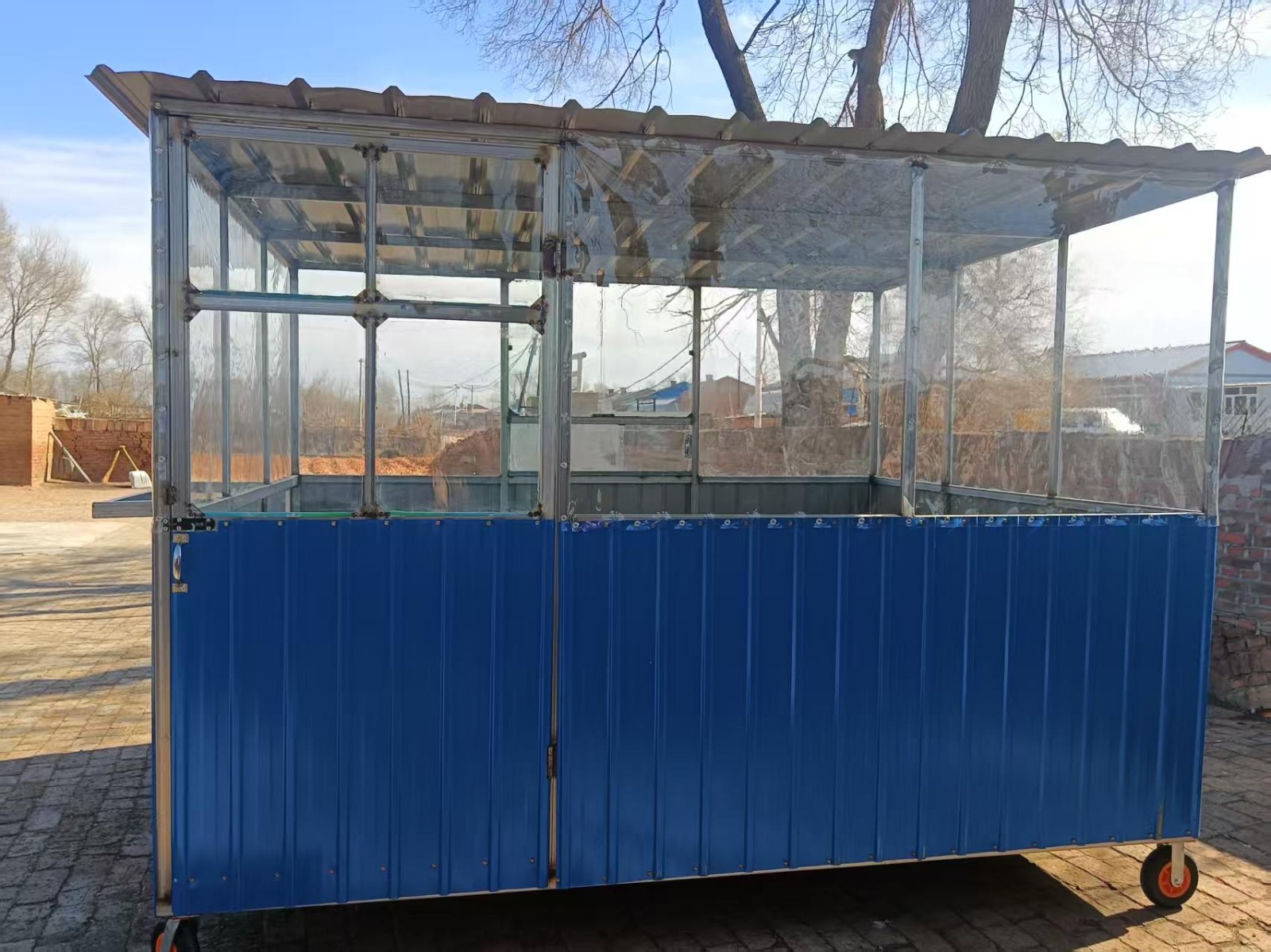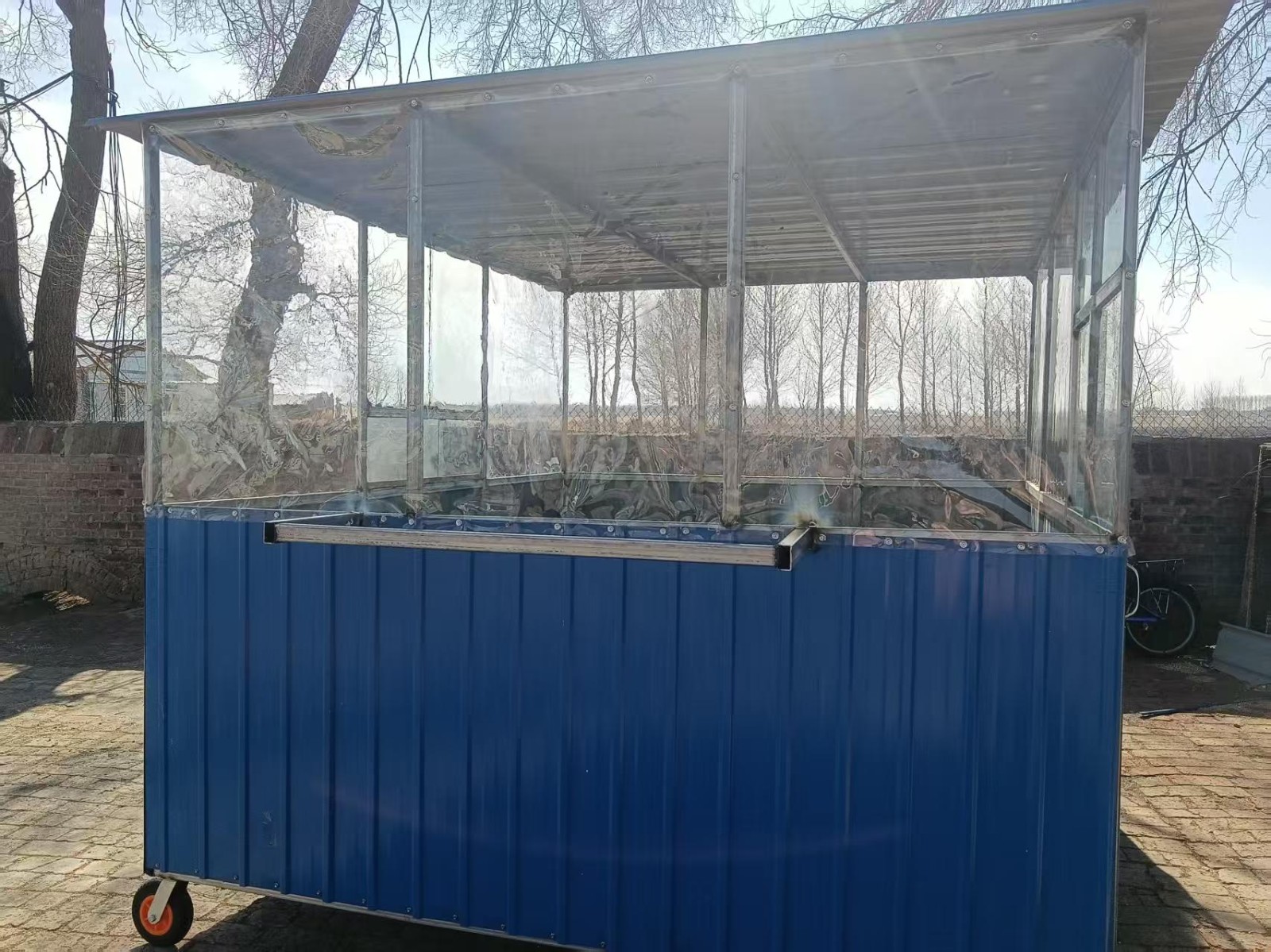 全新移动烧烤车,3米×2.5米,空间大,带轮子,推着很方便。适合做烧烤、小吃生意,摆摊、摆摊都合适。外观结实,蓝色车身,带透明围挡