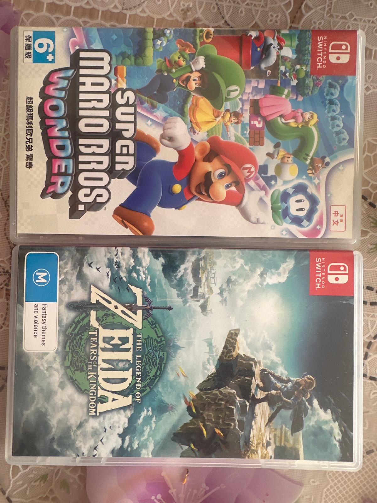 switch日版oled白色,没怎么玩,里面有几款游戏,有塞尔达传说国王之泪和马里奥惊奇两张卡,高清电视数据线,两个手柄,1500元出、有意联系